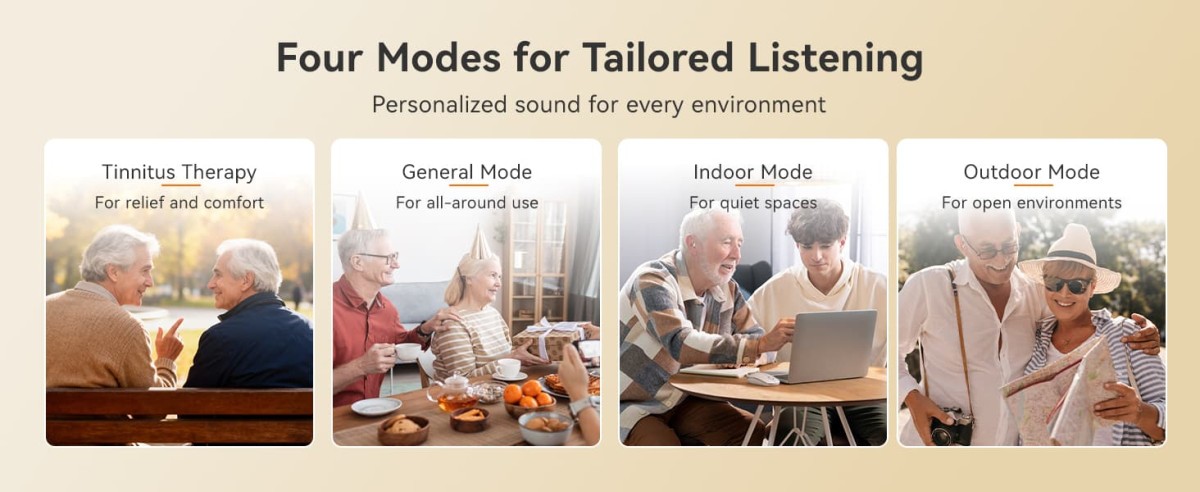By pressing and holding the up or down button for 3 seconds on this hearing aid, designed for middle-aged and elderly users and featuring a tinnitus masking mode, you can switch between four modes: