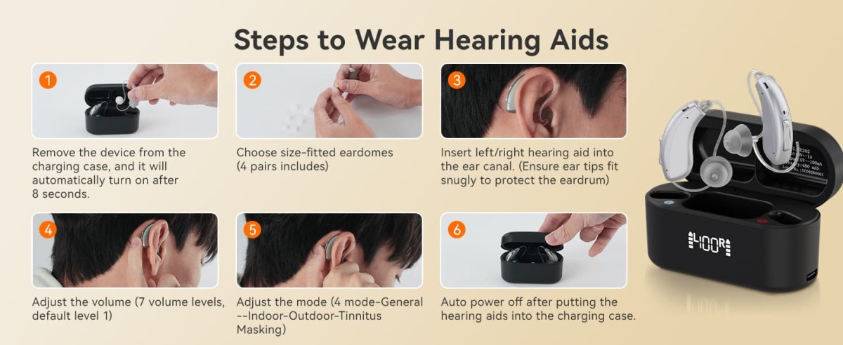 ① When using these TE202 noise-canceling hearing aids, do not insert them too deeply. The ear tips should just cover the ear canal to avoid damaging the eardrum.