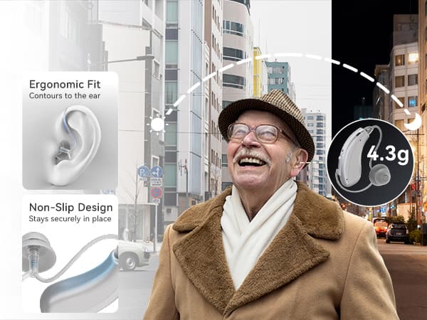 This BTE hearing aid features an ergonomic, non-slip design, a rechargeable charging case that provides three charges, and one-on-one after-sales service, ensuring worry-free use.